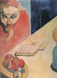 Прежде чем сделать это последнее полотно, Гоген определил его композицию в акварели, подцвеченной гуашью, красные, синие, оранжевые и желтые тона которой положены широкими четкими пятнами и сильно оконтурены. Завороженный странным лицом, рыжей бородой и деформированным туловищем друга, Гоген, не колеблясь, подчеркнул все это точными и выразительными линиями. Опершийся о деревенский стол, Мейер де Хаан с широко раскрытыми, остановившимися глазами производит впечатление человека, целиком предавшегося тоске метафизических размышлений. Лежащие перед ним подле лампы книги с четко различимыми названиями—«Потерянный рай» Мильтона и «Sartor Resartus» («Заштопанный портной»— латин.) Карлейля — придают сцене волнующий смысл, так как символизируют вечное противоборство добра и зла.