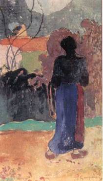 По своему обыкновению Гоген предварил обе эти композиции большим количеством набросков отдельных деталей. Акварель, которую мы воспроизводим, написана на шелке, как японский веер, и соответствует правой части картины из Праги. Четкие контуры, широкие цветовые плоскости, выдержанные в приглушенных, лишенных теней и почти не моделированных оттенках, отчетливо передают как иератичную позу молодой крестьянки в сабо, так и строгую красоту окружающего ее пейзажа. «Я люблю Бретань,—сказал как-то Гоген своему другу Шуффенекеру.—Я нахожу там дикость и первобытность. Когда мои сабо стучат по ее граниту, я слышу тот глухой, плотный, мощный звук, который сам ищу в живописи».