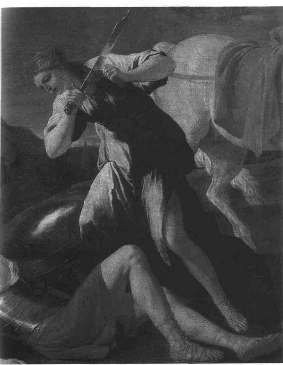 Однако в пределах этой схемы применены несколько чрезвычайно удачных новых штрихов, необходимых для образного решения темы. Так, первопланные фигуры размещены не в одном, а в разных пространственных слоях, и ни одна из них не заслоняет другую. Здесь, несомненно, имеет значение и чисто стилевой момент — стремление к классической ясности. Но, помимо того, еще одно соображение заставило мастера прибегнуть к подобному расположению фигур. Эрминия, стоящая на полшага позади лежащего на земле Танкреда, наклоняется вперед, и лицо ее попадает в одну плоскость с опущенной на плечо головой раненого рыцаря. Взгляд царевны прикован к его лицу; встревоженная, она ждет, что жизнь вернется к ее возлюбленному. Очнется он, откроет глаза, и взоры их встретятся, этот тонкий композиционный прием играет тем более важную роль в образном решении темы, что через него раскрывается внутренняя связь между двумя главными персонажами.