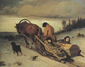 Колорит Перова обрел новую, более острую, тональную выразительность в таких картинах, как «Проводы покойника» (1865) и «Тройка. Ученики мастеровые везут воду» (1866; обе — там же); крестьянские похороны в первом случае и эпизод из жизни обездоленных детей-подмастерьев во втором предстают уже не просто социальной сатирой, но драмой об «униженных и оскорбленных», по смыслу своему общечеловеческой. Сила символико-психологического обобщения — и соответственно параллели с прозой Ф. М. Достоевского, — еще более значительны в «Утопленнице» и в особенности в картине «Последний кабак у заставы» (обе — 1868, там же). Туманный утренний город за фигурой женщины-самоубийцы и (в «Кабаке .») закат, гаснущий за городской чертой кажутся роковым порубежьем, придающим серой и низменной бытовой среде подобие земного ада.