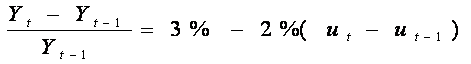 где Yt – фактический ВВП данного года, Yt - 1 – фактический ВВП предыдущего года, т.е. в левой части уравнения записана формула отставания ВВП по годам, ut – фактический уровень безработицы данного года, ut – 1 - фактический уровень безработицы предыдущего года, 3% - темп роста потенциального ВВП, обусловленный: