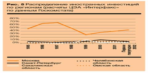 Лидером по объему иностранных инвестиций остается Москва, на долю которой по итогам первого полугодия 2002 года пришлось 44,4% общего объема иностранных инвестиций, поступивших в Россию. Объясняется это тем, что российская столица по-прежнему является крупнейшим промышленным и финансовым центром с развитой инфраструктурой и наиболее высоким платежеспособным спросом населения.