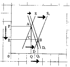 Графическое изображение. В соединении с неэластичным спросом на сельскохозяйственные продукты эти изменения в предложении и спросе способствовали снижению фермерских доходов. Это иллюстрирует рисунок 1, на котором показан значительный рост предложения по сравнению с очень умеренным увеличением спроса. Из-за неэластичности спроса на сельскохозяйственные продукты эти изменения привели к резкому падению цен на продукцию фермеров, сопровождаемому относительно небольшим приростом объема продаж. Поэтому фермерские доходы имеют тенденцию к понижению. На схеме доход до прироста предложения (показанный прямоугольником 0PAQ) превышает фермерский доход после прироста предложения (0P1BQ1). "Потеря" дохода P1PAC полностью не компенсируется "приростом" дохода QCBQ1.