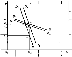 Колебания внутреннего спроса. С другой стороны. нестабильность фермерских доходов в кратковременном периоде связана со сдвигами кривой спроса на сельскохозяйственные продукты. Давайте предположим, что тем или иным образом производство сельскохозяйственной продукции стабилизировано на "нормальном" уровне, обозначенном на рисунке 3 Qn. Далее, из-за неэластичности спроса на сельскохозяйственные продукты кратковременные колебания спроса на них, вызванные, может быть, циклическими изменениями в экономике, повлекут за собой заметные различия в ценах и доходах в связи с тем, что уровень производства, как мы предположили, является постоянным. То есть незначительное падение спроса с D1D1 до D2D2 вызовет снижение фермерских доходов с 0P1aQn до 0P2bQn. Относительно небольшое снижение спроса дает коренное уменьшение денежного вознаграждения фермеров за то же самое количество продукции. Наоборот, незначительное увеличение спроса повлечет за собой столь же резкое увеличение фермерских доходов за тот же самый объем продукции. Такие большие изменения цен и доходов связаны с тем, что спрос является неэластичным. Эту связь можно понять, если рассмотреть намного меньшие изменения цен и доходов, которые сопровождают точно такой же сдвиг более эластичной кривой спроса D3D3. Если спрос падает с D3D3 до D4D4, цена снизится очень умеренно с P1 до Р4 и доход понизится только с OP1aQn до QP4cQn.