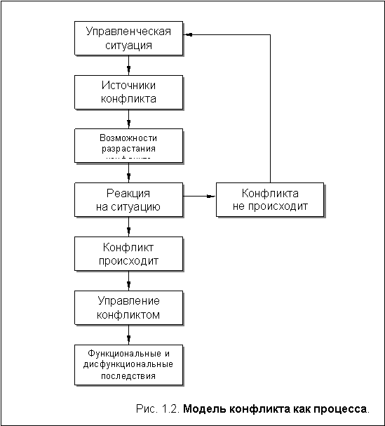 Рис.1.2 представляет модель конфликта как процесса. Из нее видно, что существование одного или более источников конфликта увеличивает возможность возникновения конфликтной ситуации в процессе управления. Однако, даже при большой возможности возникновения конфликта, стороны могут не захотеть реагировать так, чтобы и дальше усугублять ситуацию. Однако во многих ситуациях человек будет реагировать так, чтобы не дать другому добиться цели. Настоящий конфликт часто проявляется при попытке убедить другую сторону или нейтрального посредника, что «вот почему