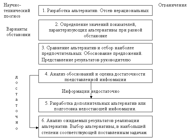 Первым шагом является разработка возможных альтернатив выполнения задачи и отсев нерациональных. Затем для каждой альтернативы определяются значения характеризующие ее показателей: степень выполнения задачи, ожидаемые затраты, предполагаемый срок выполнения задачи и т.п. После этого альтернативы сравнивают, отбирают наиболее предпочтительные и представляют руководителю. В материалах, подготовленных для руководителя, обычно содержатся обоснования, приводимые в подтверждение выводов специалистов о предпочтительности предложенных сочетаний целей. Руководитель рассматривает представленные ему варианты и выбирает один из них для реализации. В этом случае решение принято. Если руководитель не сочтет обоснования убедительными, он дает специалиста задание рассмотреть дополнительные варианты или подготовить недостающую информацию. В этом случае процесс принятия решения продолжается.