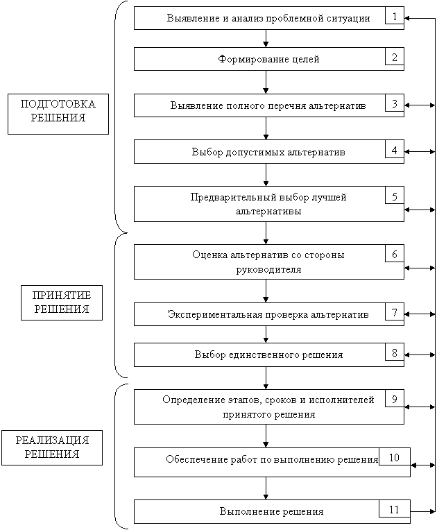Упорядочение процесса подготовки, принятия и реализации решения в какой-то мере компенсирует недостатки, обусловленные невозможностью решить проблему только с помощью количественных методов анализа на основе использования четких однозначных алгоритмов. Рассмотрение возникших проблем в строгой логической последовательности дает возможность плодотворно сочетать формальные и эвристические методы в процессе подготовки и принятия решения и добиваться более высокого его качества.