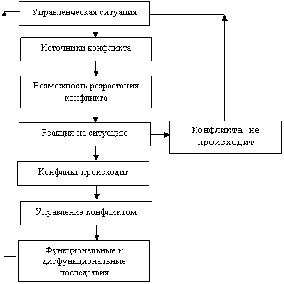 Рисунок представляет модель конфликта как процесса. Из нее видно, что существование одного или более источников конфликта увеличивает возможность возникновения конфликтной ситуации в процессе управления. Однако, даже и при большей возможности возникновения конфликта, стороны могут не захотеть реагировать так, чтобы и дальше усугублять ситуацию. Одна группа исследователей обнаружила, что люди не всегда реагируют на конфликтные ситуации, которые влекут за собой малые потери или которые они считают малоопасными . Другими словами, иногда люди понимают, что потенциальные выгоды участия в конфликте не стоят затрат. Их отношение к этой ситуации выражается следующим: «На этот раз я разрешу ему поступить по-своему».