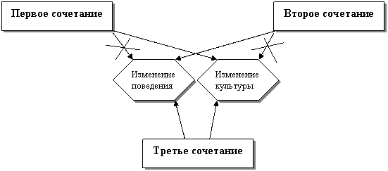 Третье сочетание — изменения происходят и в области поведения, и в области культуры. Это ситуация постоянных изменений в том смысле, что люди по-настоящему и искренне ценят то, что они по-новому делают свою работу. Устойчивость изменений в этом случае обеспечивается тем, что обе стороны (поведение и культура) взаимно усиливают и поддерживают друг друга. Это, в свою очередь, усиливает внутреннее удовлетворение в силу того, что люди действительно все больше верят в изменения и ценят их, меняя свое поведение и дальше. Графически все возможные сочетания можно представить следующим образом: