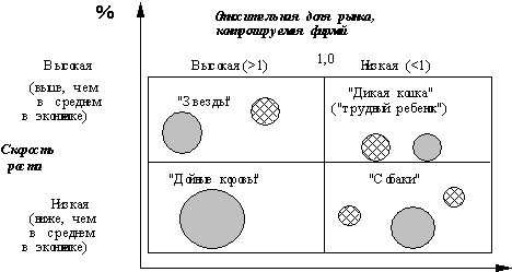 Матрица БКГ (Рис.7) содержит четыре квадранта в координатах скорость роста отрасли - относительная доля рынка, контролируемая фирмой. Каждая СЗХ определяется кругом в этих координатах, причем площадь круга представляет объем продаж СЗХ или относительную долю СЗХ в продажах всей фирмы.
