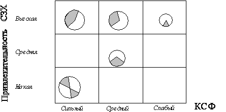 Пионером в разработке усовершенствованной матрицы стратегического портфеля СЗХ фирмы с переменными: привлекательность СЗХ - КСФ является фирма "Дженерал Электрик" (в сотрудничестве с консультативной фирмой Mc Kinsey). Эта матрица имеет размерность 3x3. Обычно в этой матрице площади кругов, отображающие СЗХ, пропорциональны объемам продаж в них, а заштрихованные секторы показывают долю рынка, контролируемую фирмой (рис. 8).