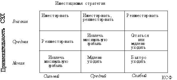 Видно, что фирма планирует усиление КСФ и роста объемов продаж в долгосрочной перспективе СЗХ С и D, несущественное изменение положения СЗХ B (для нее наступает фаза зрелости), уход из СЗХ А и зарождение новой СЗХ E, для которой, очевидно, следует планировать инвестиции в НИОКР.