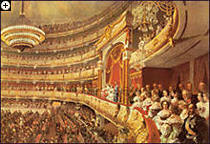 .Четверка лошадей, расположенная в один ряд, несется вскачь, увлекая за собой квадригу - античную колесницу на двух колесах. Управляет ими бог Аполлон, его голова увенчана венком, в левой руке лира . При реконструкции зрительного зала Кавос изменил форму зала, сузив его к сцене, углубил оркестровую яму. Позади кресел партера, где раньше была галерея, он устроил амфитеатр. Размеры зрительного зала стали: почти равная глубина и ширина - около 30 метров, высота - около 20 метров. Зрительный зал стал вмещать свыше 2000 зрителей. ![]()