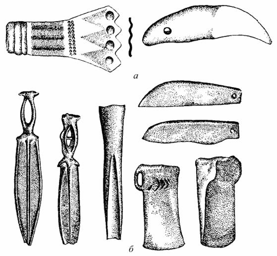 В начале II тысячелетия до н. э. бронза получила распространение на огромной территории теперешних многих областей Советского Союза. Территория Казахстана, степной и лесостепной части Западной Сибири и Южного Приуралья была занята племенами с весьма однородными для всех мест памятниками так называемой андроновской культуры (по названию места первой находки у с. Андроново Красноярского края). Хотя андроновская культура и близка к культуре катакомб по многим признакам, развитие ее литейных ремесел находилось на более низком уровне. На рис. 1, а представлены изделия из бронзы андроновской культуры. Некоторые из литых находок представляют собой простейшие отливки, в то время как отливки катакомбной культуры сложнее и более качественно выполнены. Быть может это объясняется тем, что наиболее характерные отливки андроновской культуры пока не известны.