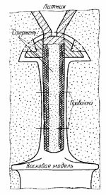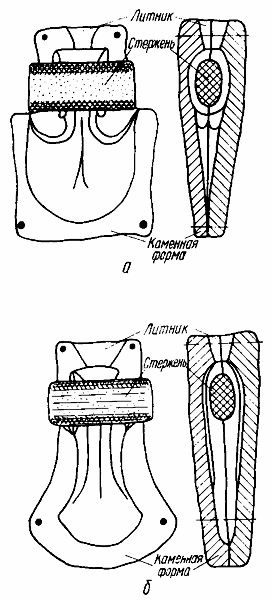 В Государственном историческом музее хранятся ничем не примечательные удила этого периода, найденные близ озера Иссык-Куль. Неизвестно, по какой причине удила не были использованы в работе и даже не были обработаны после литья: на них сохранились литники, заливы и т. п. (рис. 2, е). Именно это позволило с большой достоверностью восстановить очень сложную технологию литья, которая была применена почти 2500 лет тому назад. Отливались они в каменных формах последовательно, то есть сначала отливалось одно звено, а затем к нему во второй форме приливалось второе. На стыке звеньев применен сложный глиняный разъемный стержень; он не только служил для выполнения отверстия в кольце второго звена, но в нем располагалось и кольцо уже готового звена. Такой прием литья удил в те древние времена представляется весьма совершенным.