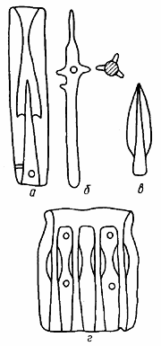 Скифские литейные формы наконечников обычно состояли из двух или трех металлических частей (рис. 6, а), формировавших наружную поверхность отливки, и стержня (рис. 6, б), предназначенного для выполнения внутреннего отверстия наконечника (рис. 6, в). Собранная форма скреплялась специальными обручами и устанавливалась вертикально. Для этого наружный конец стержня вставляли в землю или в соответствующее отверстие специального приспособления. Ряд таких форм заливали расплавленной бронзой через верхнее отверстие. Впоследствии верхнюю часть отливки (прибыль) отламывали, а место излома в наконечнике соответствующим образом затачивали.