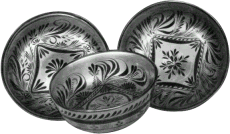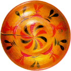 Рисунки на чашах и блюдах основаны на тонком понимании приемов композиции орнамента в круге. Расписывая чашки и блюда, мастера четко выделяли их дно, помещая на нем розетку с линиями, расходящимися от центра подобно солнечным лучам. На более крупных вещах вокруг розетки рисовали квадрат или ромб с мягко закругленными углами, который называли пряником, благодаря его сходству с настоящим узорным пряником, положенным в чашку. Вокруг центра чашки исполняли узор, связанный с движением кисти по кругу. Самый простой рисунок при этом состоял из вертикальных или наклонных красных и черных мазков. Усложняя его, мастера помещали рядом по два или по три красных и черных удлиненных мазка, соединяя внизу их концы. Получался мотив так называемой "лапки", напоминающий птичий след на снегу.
