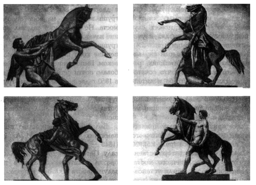 под бронзу. Повторные экземпляры обеих групп, отлитые из бронзы в 1842 г., так и не попали на предназначенное для них место; они были перевезены в Берлин и установлены на пьедесталах по обеим сторонам главных ворот королевского дворца. В 1843 — 1844 гг. Клодт в третий раз отлил бронзовые экземпляры и поставил их на восточной стороне моста. Им, однако, недолго пришлось оставаться на месте. Весной 1846 г. они были сняты и отправлены в Неаполь, где и поныне стоят у входа в дворцовый сад. Гипсовые экземпляры групп вернулись на восточную сторону моста. Но Клодт уже задумал продолжение начатого ансамбля и создал две новые группы — вырывающегося в яростном порыве коня и коня, укрощенного человеком. Выполнение новых моделей потребовало почти четырех лет труда, и только в 1850 г. две новые бронзовые группы были установлены вместо гипсовых. Скульптурный ансамбль, над которым Клодт работал около 18 лет, был наконец завершен.