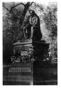 Для увековечения памяти величайшего из национальных поэтов было принято решение о сооружении памятника А. С. Пушкину. Среди многочисленных работ, представленных на конкурс, убедительную победу одержал проект Александра Михайловича Опекушина (1838 — 1923). Памятник, отлитый в 1880 г., прошел испытание временем и до сих пор любим народом (рис. 12). Опекушин изобразил Пушкина одетым в длинный сюртук, поверх которого наброшен широкий плащ. Обращаясь к традициям русской и мировой классики, скульптор сумел добиться большой пластической выразительности статуи. Поза поэта отличается непринужденностью, не исключающей, однако, благородной величавости и поэтической возвышенности.
