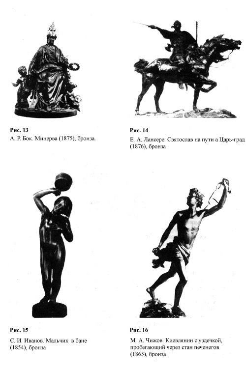 Во второй половине XIX в. скульптура как бы отходит на второй план после живописи, что особенно относится к литой монументальной и декоративной скульптуре. Это вызвано протестом художников против академической системы преподавания — творить только на отвлеченные мифологические темы. Среди первых скульпторов, обратившихся к бытовому жанру, были С. И. Иванов, М. А. Чижов, В. А. Беклемишев, М. М. Антокольский и др.