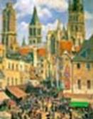 Писсарро концентрирует свое внимание не на достопримечательностях города, не на особенностях архитектуры того или иного памятника старины, а на создании целого образа-впечатления, ценного своим неповторимым очарованием. Художник обращает в живописные массы группы теснящихся старых домов, любуется контрастами теней, обволакивающих нижние этажи, и ярких солнечных лучей, с трудом попадающих в узкие улочки. В некоторых листах, как, например, «Площадь Репюблик. Руан» Писсарро достигает небывалого еще эффекта, показывая площадь, затянутую сеткой дождя, с клубящейся влажной атмосферой.