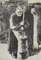 Во многих других литографиях, таких, как «Косец» (ок. 1894), «Сеятель» (1896), «Женщина, сбивающая масло» (ок. 1896), «Женщины, несущие хворост», Писсарро показывает крестьян за тяжелой работой, дает обобщенный и вместе с тем типичный образ, идея которого раскрывалась бы с одного взгляда; здесь можно видеть тот интерес к социальной характеристике персонажа, который впервые появился в картинах и гуашах второй половины 80-х — начале 90-х годов. Если графическое творчество Писсарро в целом получило высокую оценку и современников и последующих исследователей, то, говоря о литографиях, подобных тем, которые названы выше, Писсарро упрекали в «неумении рисовать»; его единственным достижением в гравюре и литографии считали городские и сельские пейзажи . В этом сказывался страх буржуазных критиков перед действенной силой реалистического метода Писсарро, перед критическим отношением к современной ему действительности, особенно ярко воплотившимся в цикле его рисунков «Социальные мерзости» (1890, Швейцария, частное собрание), который до сих пор не опубликован полностью.