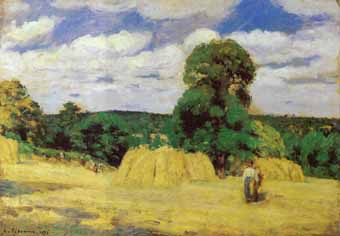 Картины, показанные Камилем Писсарро на третьей выставке импрессионистов, говорят о том, что природа в его искусстве приобретает новые черты. «Жатва» (1876, Париж, Лувр) — пейзаж, написанный в Бретани, где, по словам художника, он нашел «настоящую деревню» . Исполненная широким мазком, в насыщенных тонах — среди них преобладают желтый и зеленый, — картина передает жар полуденного солнца и ширь полей, на которых крестьяне собирают урожай. Фигура женщины в голубой юбке со снопом в руках, зеленое дерево, которое по мощи сродни дубам Дюпре, объемные скирды желто-золотой пшеницы — все это призвано передать величие плодоносящей земли. Довольно вытянутый по горизонтали формат картины, линия горизонта, делящая пейзаж почти на две равные части, усиливают ощущение покоя и даже некоторой торжественности происходящего.