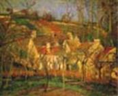 Дома в картинах Писсарро — это не просто архитектурные массы, объемы, которыми можно строить пространство, это всегда человеческие жилища, неподалеку от которых можно заметить их обитателей. И в двух пейзажах 1877 года белые домики так уютно расположены под сенью стройных деревьев, так хорошо укрыты от ветров склоном холма, так сплоченно стоят друг подле друга, что невольно приходит мысль о счастье жить в сельской местности, о дружелюбной близости природы и человека.