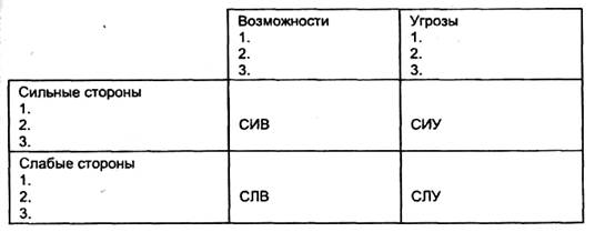 Матрица образует четыре поля: СИВ (сила и возможности); СИУ (сила и угрозы); СЛВ (слабость и возможности); СЛУ (слабость и угрозы). На каждом из полей необходимо рассмотреть все возможные парные комбинации и выделить те, которые должны быть учтены при определении маркетинговых возможностей предприятия.