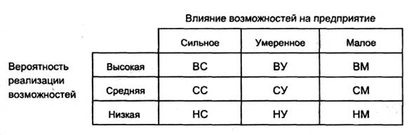 Полученные внутри матрицы девять полей возможностей имеют разное значение для предприятия. Возможности, попадающие на поля ВС, ВУ, СС, необходимо обязательно использовать. Возможности же, соответствующие полям СМ, НУ, НМ, практически не заслуживают внимания. В отношении оставшихся возможностей необходим гибкий подход. Можно принять положительное решение об их использовании, если для этого имеются достаточные ресурсы.