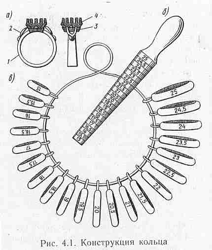 Конструктивно ювелирные кольца (кроме обручальных и безкаменных) состоят из двух основных частей: нижней — шинки или ободка и верхней или верхушки. Встречающиеся различия в конструкции колец обусловлены изменением формы, материала, размеров и огранки вставок.