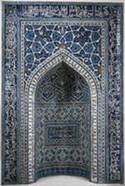 преимущественное развитие как переносной – деревянный, керамический либо изображенный на молитвенном ковре. Вогнутый михраб (в форме глубокой сводчатой ниши) впервые был устроен около 709 г. в мечети Хаарам в Медине (основана в 656 г. на территории дома Мухаммада), заново сооруженной в 707-709 гг. коптскими и византийскими мастера-ми; предположительно обозначал местонахождение пророка во время ведения им ритуала молитвы. После 709 г. михраб стал обязательным признаком мечети. Обычно он выделялся в интерьере освещением и нарядным декором, снаружи – выступом ниши; нередко перед михрабом возводился купол с фонарем или с окнами в барабане. Центральный вход и михраб непременно украшаются графическими изображениями. В помещении ниша - михраб, около нее ставится кафедра проповедника - минбар. Обычно он располагается справа от михраба и является привилегией только пятничной мечети (джами). В небольших населенных пунктах мечети могли его не иметь. Минбар обычно похожая на трон кафедра (иногда под балдахином) открыта на спускающуюся в зал лесенку с перилами и декоративным порталом