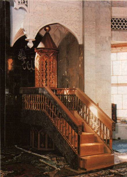 или дверцей. Деревянные (реже каменные или кирпичные) минбары украшены (в соответствии с художественным стилем эпохи и региона) орнаментальной резьбой, инкрустацией, росписью, иногда глазурованными облицовками или фаянсовой мазаикой. Первый минбар (сиденье с двумя ступенями) был сделан по заказу Мухаммада в 629 г. для чтения проповедей. Первоначально минбар служил также троном правителя и местом для судьи. Исключительно культовое значение минбар приобрел в конце периода Омейядов, около 750 г., и в правление династии Аббаситов (750-1258 гг ). Одновременно сложился тип минбара как произведения монументально-декоративного искусства: высокая, похожая на трон кафедра (иногда под балдахином).
