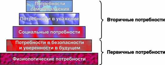 По теории Маслоу все эти потребности можно разложить в виде строгой иерархической структуры (рис. 1.1.), в которой они располагаются в соответствии с приоритетом. Поведение человека определяет самая нижняя неудовлетворенная потребность в иерархической структуре. После того, как потребность удовлетворена, ее мотивирующее воздействие прекращается.