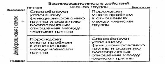 • высокая взаимозависимость — высокая дифференциация в оплате.
