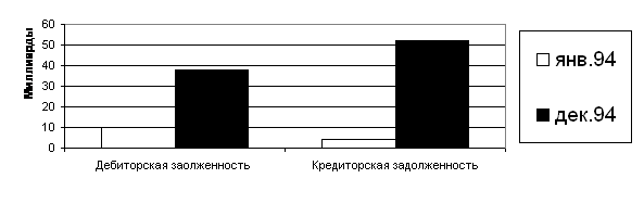 Кредиторская задолженность предприятия возросла с 4,5 млрд. рублей в январе до 51,7 млрд. в декабре. Основную часть задолженности составляли долги по отчислениям в бюджет и поставщикам материалов, в том числе энергоресурсов и комплектующих узлов и деталей. Дебиторская задолженность увеличилась с 10 млрд. рублей до 38,8 млрд. рублей (Рис. 8). Основными дебиторами являлись МПС, судостроительные заводы России и Украины, предприятия корпорации Росуголь.