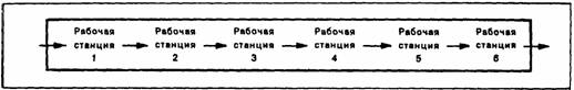 ЛИНЕЙНАЯ ИЛИ ПОТОЧНАЯ ПЛАНИРОВКА применяется в массовом производстве или в системах с непрерывными процессами, где каждое выпускаемое изделие фактически проходит одни и те же операции обработки. Производственные ресурсы располагают в виде последовательности рабочих мест в соответствии с теми операциями, которые требуются для выпуска готового «продукта», как это показано на рисунке 4. Наглядным примером такой планировки служит сборочная линия. В сфере услуг такую планировку следует использовать, например, в учреждении, обрабатывающем заявления на выдачу водительских прав. Основная проблема при такой планировке заключается в правильном распределении нагрузки на рабочие места во избежание образованияузких мест.