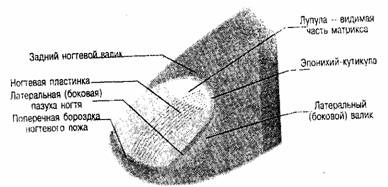 Ногтевой корень и матрикс защищены промаксималь-ной ногтевой складкой, которая представляет собой складку кожи в основании ногтя. Выше промаксимальной ногтевой складки находится белое полулунной формы образование лупула, которое является продолжением матрикса. Так как растущий ноготь продолжает затвердевать в процессе своего роста над лупулой, он сначала остается мягким и легко может быть поврежден.