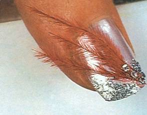 Маленькие перышки. При закреплении собственно перо должно остаться за пределами ногтя. Перышки - украшение недолговечное, но их вполне хватит на вечер, где вы хотите поразить окружающих своим экстравагантным видом. Для особой изысканности перо можно посыпать сверху специальным блеском.