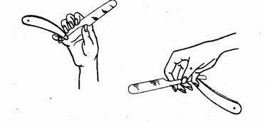 2. Бритву располагают режущей кромкой вверх. Большой палец находится на шейке бритвы со стороны мастера, остальные пальцы — с противоположной стороны бритвы.