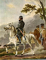 В далеком заточении декабрист Вильгельм Кюхельбекер вспоминал об этой картине: .Софа, в углу комод, а над софою Не ты ль гордишься рамкой золотою, Не ты ль летишь на ухарском коне, В косматой бурке в боевом огне, Летишь и сыплешь на врагов перуны, Поэт наездник, ты, кому и струны Волшебные и меткий гром войны Равно любезны и равно даны. |