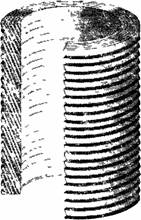 Рис. 1-3. Стержень волоса в разрезе, с удаленной частью кутикулы и открытым кортикальным слоем