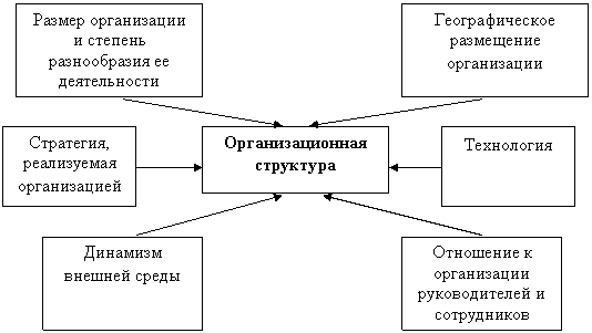 Выбор той или иной организационной структуры зависит от целого ряда факторов. Наиболее существенными по значимости и степени являются следующие факторы: размер и степень разнообразия деятельности, присущие организации; географическое размещение организации; технология; отношение к организации со стороны руководителей и сотрудников организации; динамизм внешней среды; стратегия, реализуемая организацией.(рис. 7)