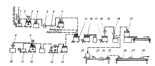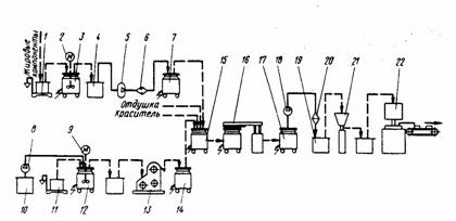 Пигментная паста и жидкий краситель, отвешенные на весах II, компонент из емкости 10 насосом 8 подаются в емкость 12 с мешалкой 9. Полученную смесь подвергают вальцеванию на трехвалковой машине 13 и готовую пигментную пасту добавляют в емкость 14.