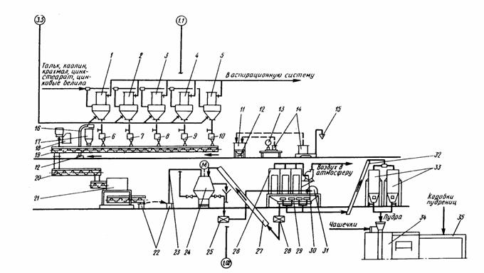 Отвешенные на весах 1 жировые компоненты загружаются в передвижную емкость 3, которая устанавливается под настенной мешалкой 2. Расплавленную массу из промежуточной емкости 4 перекачивают насосом 5 через фильтр 6 в емкость 7. Одновременно в емкость 15 загружают красители, пленкообразующие компоненты, расплавленную жировую основу и проводят эмульгирование массы в гомогенизаторе 16. Готовая маем из сборника 77 через фильтр 20 насосом 18 подается в емкость 19 и пропускается через коллоидную мельницу 21. Далее готовая масса подается в машину для автоматического наполнения и укупорки.