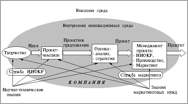 Концепция продукта и разработанный продукт – совершенно разные вещи. Между ними годы и огромные издержки на НИОКР и подготовку производства. Подробно эти процессы будут описаны в соответствующих главах. Однако все ранее изложенное свидетельствует, что инновация, как правило, результат сложного взаимодействия различных сфер деятельности фирмы. Это иллюстрируется рис. 8.