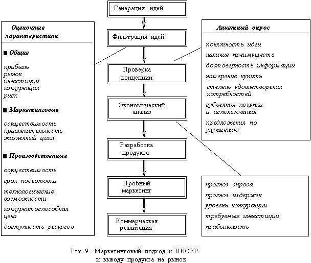 В дальнейших главах реализация отдельных этапов инновационного процесса будет рассмотрена более подробно. В качестве обобщения маркетингового подхода к НИОКР и выводу продукта на рынок приводится рис. 9.