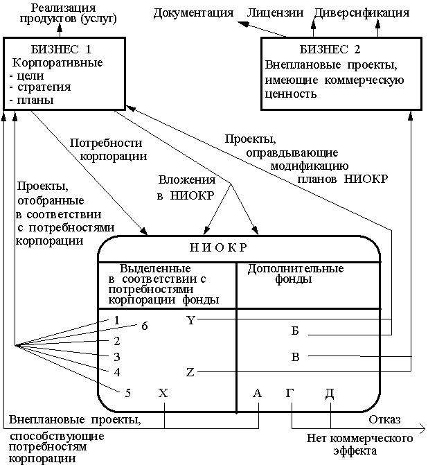 Бизнес 1 предполагает выделение ресурсов на НИОКР, большая часть которых расходуется на выполнение проектов, непосредственно связанных с реализацией стратегии корпорации (проекты 1-6). Часть средств выделяется на усмотрение руководителя НИОКР и используется для финансирования индивидуальных или неясных по результатам исследований. Проекты X, Y, Z – расширение формальной программы НИОКР или новые неожиданные возможности, появившиеся в ходе выполнения основной программы. Проекты А-Д возникают как результат исследований по дополнительным фондам.