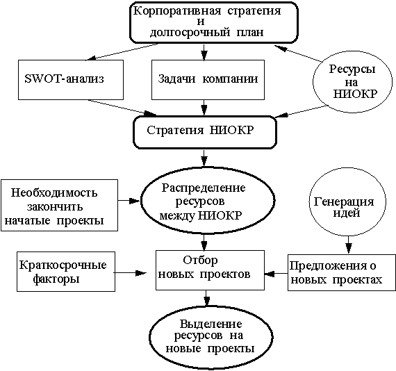 Одной из задач стратегического менеджмента корпорации является управление инновациями в ней, прежде всего, посредством решений по отбору проектов и распределению ресурсов. При этом необходимо обеспечить комплексный процесс принятия решения от верхнего уровня менеджмента до уровня управления НИОКР.