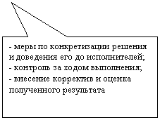 На стадии реализации решения принимаются меры для конкретизации решения и доведения его до исполнителей, осуществляется контроль за ходом его выполнения, вносятся необходимые коррективы и даётся оценка полученного результата от выполнения решения. Каждое управленческое решение имеет свой конкретный результат, поэтому целью управленческой деятельности является нахождение таких форм, методов, средств и инструментов, которые могли бы способствовать достижению оптимального результата в конкретных условиях и обстоятельствах.